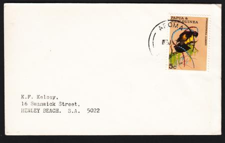 | "AROMA/-3JY70/(T.P. & N.G.)" (Central Province)(First Day New Postmarker) on 5c Pteridophora Alberti on plain cover to Henley Beach S.A. Postmarker AR-2. This was in use from 3 July 1970 to 5 January 1973 and presumed destroyed in the fire on 6 January 1973.
