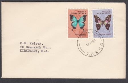 | "BOROKO/12JY66/T.P. & N.G." (National Capital District) (First Day Of New Postmarker) on 1c Papilio Ulysses and 4c Graphium Weiskei on plain cover to Kirkcaldy S.A.. Postmarker BK-2. In use from 12 July 1966. Bars 12mm long on left and 12mm long on right. No time wheels. Withdrawn 30 June 1977.
