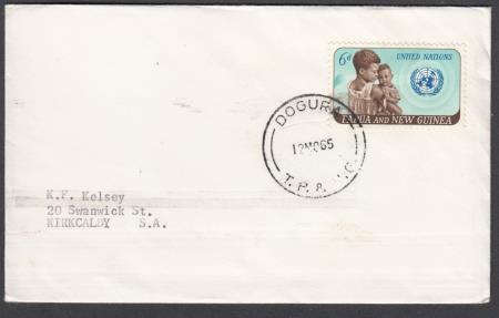 | "DOGURA/12NO65/T.P. & N.G." (Milne Bay Province) on 6d Mother and Child on plain cover to Kirkcaldy S.A.. Postmarker DG-1. Placed in service 1 November 1965