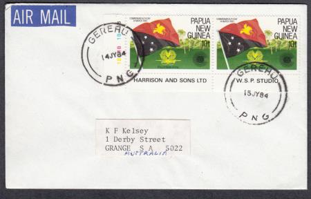 | "GEREHU/15JY84/PNG" (National Capital District) on Corner Imprint (Harrison And Sons Ltd W,S.P. Studio) Pair 10t Flag & State Arms on Air Mail cover to Grange S.A.. Postmarker GH-2 (15½mm bar on left and 15mm bar on right) Placed in use on 6 July 1981.