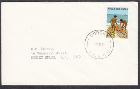 | "GOROKA/14SE71/T.P. & N.G." (Eastern Highlands Province)(First Day Of New Postmarker) on 7c Bartering Fish and Vegetables on plain cover to Henley Beach S.A.. Postmarker GK-7 was in use from 14 September 1971 until 30 June 1977. 10mm bar on left 9mm bar on right left side of "G" of "GOROKA" is straight (not rounded)
