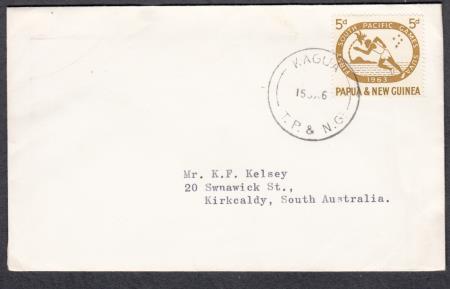 | "KAGUA/15JA64/T.P. & N.G." (Southern Highlands Province)(Post Office Opening Day) on 5d First South Pacific Games on plain cover to Kirkcaldy S.A.. Postmarker KA-1 was in use from the opening of this Post Office on 15 January 1964 to late 1978, except three periods when being repaired.