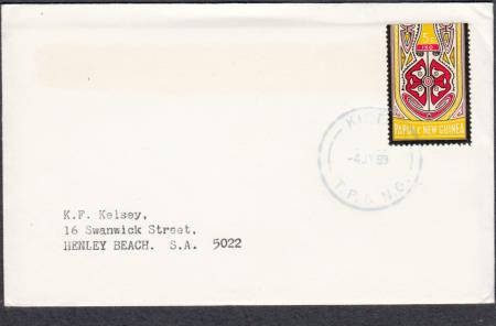 | "KIETA/-4JY69/T.P. & N.G." (North Solomons Province)(First Day New Postmarker) on 5c Iko Myth (partial) on plain cover to Henley Beach S.A.. Postmarker KT-3 was in use from 4 July 1969 to 30 June 1977.