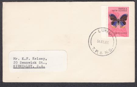 | "LUMI/31AU66/T.P. & N.G." (Sandaun Province) on 5c Terinos Alurgis on plain cover to Kirkcaldy SA.. Postmarker LM-1 was in use from the opening of this office on 29 August 1966 to late 1978/early 1979.