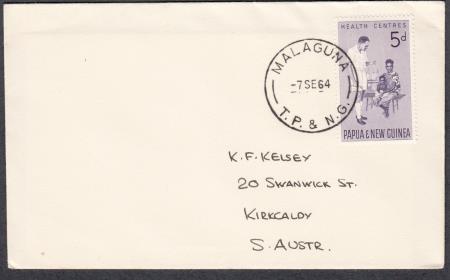 | "MALAGUNA/-7SE64/T.P. & N.G." (East New Britain Province)(Name Change to TOBOI on 1 April 1965)(First Day New Postmarker) on 5d Health Centres on plain cover to Kirkcaldy SA.. Postmarker MN-1 was in use from 7 September 1964 to 31 March 1965.
