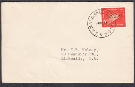 | "MARSHALL LAGOON/-8MY63/T.P. & N.G." (Central Province)(Now Kupiano)(Post Office Opening Date) on 5d Perth Commonwealth Games High Jump on plain cover to Kirkcaldy SA.. Postmarker MR-1 was in use from the opening of this office on 8 May 1963 to 31 May 1969. The name of the Post Office was changed to KUPIANO, a village at the head of MARSHALL LAGOON.