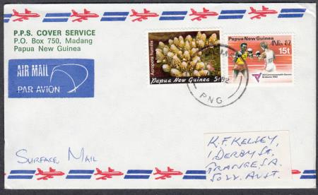 | "MUMENG/-1DE82/PNG" (Morobe Province) on5t Acropora and 15t Boxing on PPS Surface Cover to Grange SA.. Postmarker MU-2 was in use from late 1978 or early 1979.