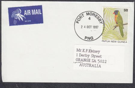| "PORT MORESBY/4/24 OCT 1997/PNG" on 50t Trichoglossus on Air Mail cover to Grange SA. with backstamp "PORT MORESBY/5/24 OCT 1997/PNG" (PM-31). Postmarker PM-30 , a rubber CDS, was sent to this office on 13 October 1997