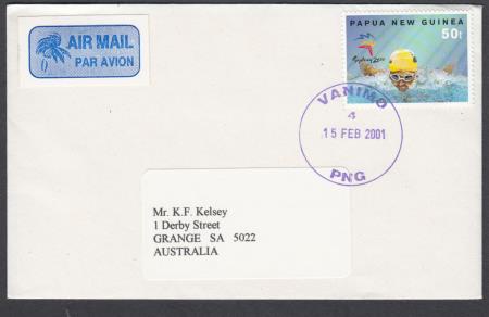 | "VANIMO/4/15 FEB 2001/PNG" on 50t Swimming Sydney 2000 Games on Air Mail cover to Grange SA.. Postmarker details not known.