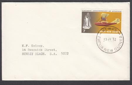 | "WEWAK/19JY72/PAPUA NEW GUINEA" (East Sepik Province)(First Day New Postmarker) on 7c Curtiss Seagull on plain cover to Henley Beach SA.. Postmarker WE-9 was in use from 19 July 1972 to 30 June 1977. Left Bar 3½mm Right Bar 3½mm A-N 2½mm.