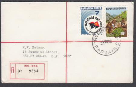 | "RELIEF NO. 1/-9NO72/PAPUA-N.G" (Western Highlands Province) and Registration label "R/MINJ, T.P. N. G./NO. 9584" on 7c National Day Flag and 30c Highlanders cultivating garden on registered cover to Henley Beach S.A. with backstamps "RELIEF NO. 1", "MOUNT HAGEN", "ADELAIDE" and "HENLEY BEACH". RELIEF CDS R-1 was in use from 26 October 1972 to about 10 or 13 November 1972 when MJ-1 was being fitted with steel date wheels.