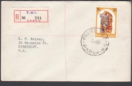 | "RELIEF NO. 3/-1AP65/PAPUA-N.G" (MALAGUNA) (East New Britain Province) (First Day Name Change) and Registration label "R/TOBOI/NO. 581/T.P. & N.G." on 2/5 Watam Head on registered cover to Kirkcaldy S.A. with backstamps "MELBOURNE", "ADELAIDE" and "HENLEY BEACH". RELIEF CDS R-3 was in use from the name change on 1 April 1965 until 6 July 1965 when the TOBOI CDS became available.