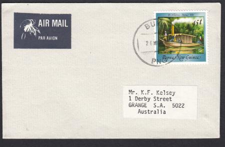 | Cover with "BUKA/26 MAR 1993/PNG" (Protruding Date Slug) (North Solomons Province) on 45t "Neva" 1876 to Grange S.A. Postmarker BC-5 a rubber CDS was sent to Buka late in February 1993 and is known to have been in use on 1 March 1993. It was reported on 8 May 1995 that this CDS was worn.
