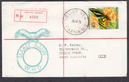 | Registered Cover with "RELIEF NO. 6/16JA76/PAPUA-N.G." (Mount Hagen - Western Highlands Province) and Registration label "R/MOUNT HAGEN/NO. 56360" and Registered Mail Cachet Marker "MAKET RAUN/WHD" in green/blue ink on 40t Chimaera to Henley Beach S.A. with backstamps "MOUNT HAGEN", "BOROKO", "MELBOURNE", "ADELAIDE" and "HENLEY BEACH". RELIEF CDS R-6 was used from the opening of this service on 16 October 1975 to 10 November 1976.