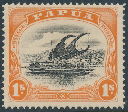 | 1908 Papua 1/- Black and Orange. Small Papua. Wmk Upright. P 12½, SG 58 MH |