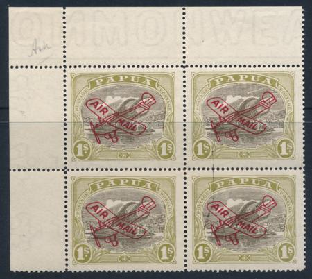 | 1930 1/- Green & Sepia Block of 4. "Rift in Clouds" variety Top Right Hand stamp. SG 120. Mint Unhinged. Ink mark on right hand stamps. |