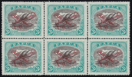| 1930 Papua 3d Black & Blue-Green Airmail, block of 6, SG 118 MUH |