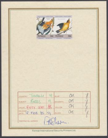 | Seven (7) Progressive Die Proofs from Format International Security Printers, London for Tuvalu Imperforated Se-Tenant Stamps issued 12 February 1985 “Birds – Leaders Of The World – The 200th Birth Anniversary of John James Audubon” comprising Six (6) Progressive Colour Proofs and One (1) Final Multi-Colour Proof Se-tenant 50c “Prothonotary Warbler” SG305 and 50c “Worm-Eating Warbler” SG306 on two cream backing cards and with Description and Colours Approved and signed off.