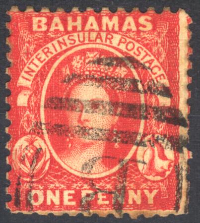 | 1882 Bahamas 1d Scarlet - Vermillion, perf 12, wmk reversed, SG 40x, Used