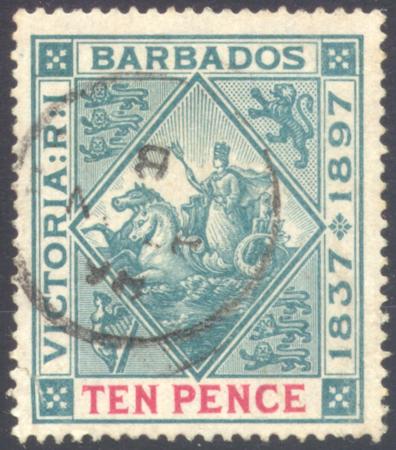 | 1897 Barbados 10d Blue-green and carmine, Torn lower right corner, SG 123 Used