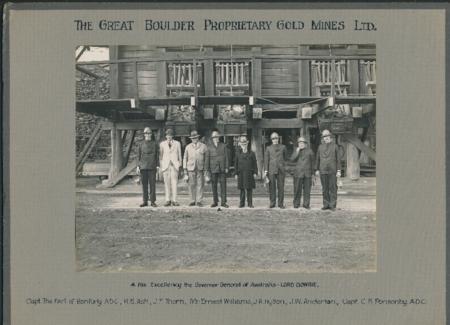 | Great Boulder Gold Mines with Gov-General Lord Gowrie. Capt the Earl of RanfurlyADC, R.B.Ash, J.F.Thorn, Mr Ernest Williams, J.R.Hylton, J.W.Anderton, Capt C.B.Ponsonby ADC. Controversy followed on the company's decision to transfer the domicile of the company from the UK to Australia early in World War Two.