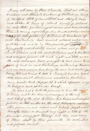 | Interest Claim Deed dated Oct 31st. 1867 from Mary Dunham et al to William T Dunham signed, sealed and delivered at Glastenbury, County of Hartford, State Of Connecticut USA with 50 Cent Blue Washington Mortgage Stamp affixed and pen cancelled for the sum of US$100 debt paid on ten acres.