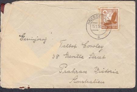 | Cover addressed to Talbot Cowley, 38 Greville Street Prahran Victoria and sent by Margarete Walther, Dresden N.23 Germany with 25pf Brown Swastika/Eagle/Globe stamp cancelled "DRESDEN N23/15.1.38. 9/A". (Cover front torn bottom and top left to stamp foxing)