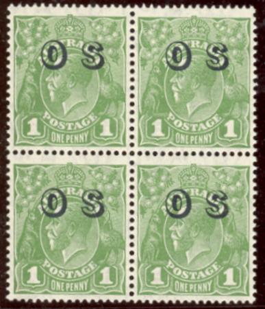 | 1d Green Opt OS, position 8/37-38,43-44 block of 4, BW 82(OS) |