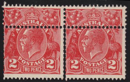 | 2d Red pair showing striking double perforations - with perforations running through stamps approximately third of way down design, BW 103b