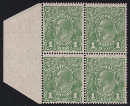 | 1d Green, marginal block of 4, position 7/31-32,37-38, BW 80(4)f + g + hb, wattle line + 1st re-entry flaw below neck |