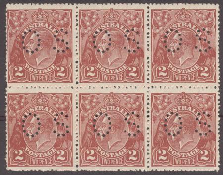 | 2d Brown Perf OS, block of 6, BW 97a, four listed varieties in block. Very high catalogue value. Position 16L13-15,19-21