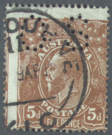 | 5d Smooth Paper Perf OS, BW 123, extremely dark shade and very off centre - stunning. Not the very scarce Intensely Dark (Black) Brown but no far off it.