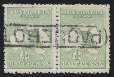 | ½d Green Roo, 1st Wmk Inverted pair with PAQUEBOT cancel, BW 1a - SG 1bw |