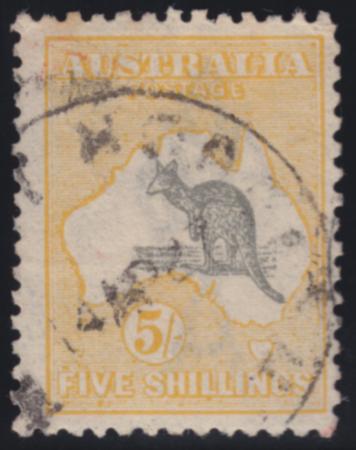 | 5/- Grey & Pale Yellow 3rd Wmk, ewe faced roo variety - position L10 BW 44D(V)n |