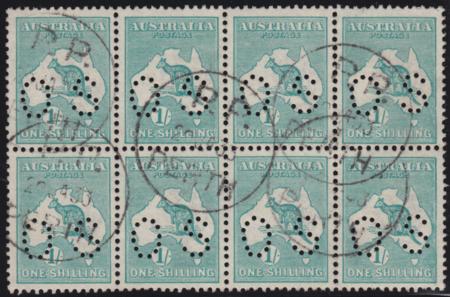 | 1/- Green Die IIB perf OS block of 8 showing variety value circle broken at base, similar to BW 33(3)g