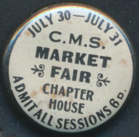 | Button badge of Church Missionary Society CMS Market Fair Chapter House July 30 - July 31 Admit all sessions 6d. |