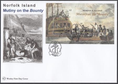 | 24-September-2019 Norfolk Island Australia Minisheet of two stamps Mutiny On The "Bounty" Wesley First Day Cover (large) with cachet "Fletcher Christian and the mutineers seize HMS Bounty on 28 April 1789. Engraving by Hablot Knight Browne, 1841" and affixed with Minisheet of two stamps: $1 Bligh Cast Adrift (37.5mm x 26mm); $2 Mutineers (37.5mm x 52mm) tied pictorial postmark Rope, Anchor, Banner, Norfolk Island N.S.W. 2899. The mutiny on the Royal Navy vessel HMS Bounty is the most famous founding narrative of Norfolk Island and one of the most infamous events in maritime history. It occurred in the South Pacific Ocean on 28 April 1789, when unhappy crew members, led by Acting Lieutenant Fletcher Christian, seized control of the ship from their captain, William Bligh, setting him and his 18 supporters adrift in a longboat. Many of the mutineers settled on Tahiti and Pitcairn Island. Today many Norfolk Islanders can trace their ancestry back to the mutiny in 1789. The descendants of the Bounty mutineers and their Tahitian consorts include the modern-day Pitcairn Islanders as well as a little less than half of the population of Norfolk Island. Some of the mutineers’ names are still carried by island residents, including Christian, Young, Adams, Quintal and McCoy. The stamps and minisheet design reproduces a handcoloured aquatint engraving made by English artist Robert Dodd in 1790. This copy of the aquatint is held in the National Library of Australia. The aquatint was issued in October 1790, only a few months after the first printing of Bligh`s account of the mutiny. It shows Bligh and his men being cast adrift in the longboat. At the moment depicted, the painter or rope of the longboat is still attached to the ship, and the four swords reluctantly allowed to the men in the longboat are about to be thrown to them. That Dodd`s sympathies lay with Bligh is made further evident in the caption, which notes that the men in the open boat "sustained life under divine providence for 41 days". (Stock - 10 Covers)
