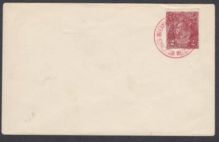 | Unaddressed Cover with 2d Red-Brown KGV Die II Stamp S.M. 14 with red cancel "INTERNATIONAL PHILATELIC EXHIBITION MELBOURNE/(1) NO28" with VARIETY:- LEFT FRAME SCALLOPED OPPOSITE ROO`S TAIL"