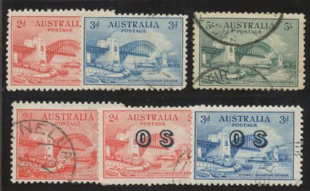 | 1932 Sydney Harbour Bridge set of 6, both 2d plus 2d and 3d OS, fine used 5/- |