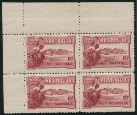 | 1927 1½d Canberra Plate # 12 on corner block of 4, BW 132zk, fluffy perfs |