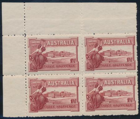 | 1927 1½d Canberra Plate # 12 on corner block of 4, BW 132zk, fluffy perfs |