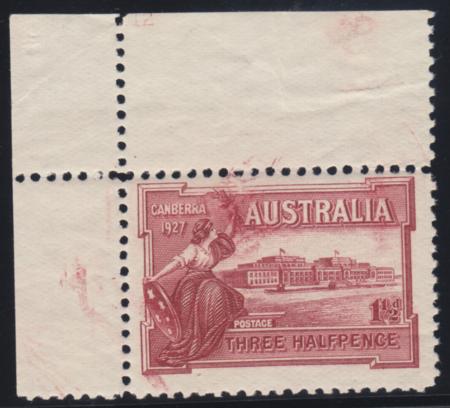 | 1927 1½d Canberra Plate # 12 in margin on single stamp, BW 132zk |