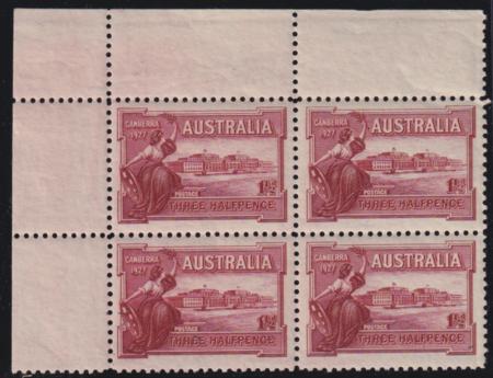 | 1½d Canberra Plate 3 or 9 (part) corner block of 4, scarce, BW 132 |