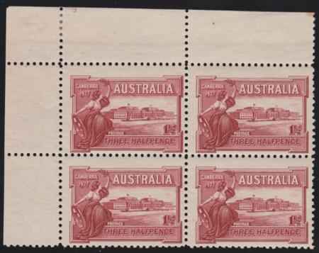 | 1927 1½d Canberra Plate # 9 on corner block of 4, BW 132zh |
