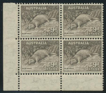 | 9d Platypus perf 15x14 No Imprint block of 4 from lower pane, BW 206zf
