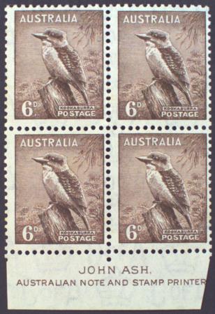 | 6d Kookaburra perf 13.5x14 Ash Imprint block of 4, BW 202za or b, no left margin |