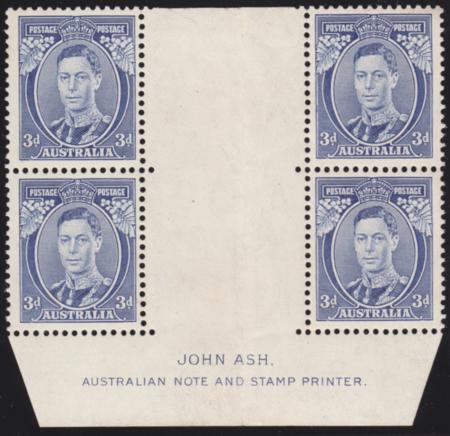 | 3d Blue KGVI Die 1 Ash Imprint block of 4, paper adhesion in margin only, BW 191z |