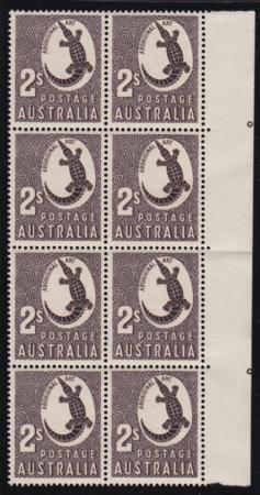 | 2/- Crocodile with no wmk, Perf Pip Type 1 (2 dots)block of 8 from right of sheet, BW 264ba