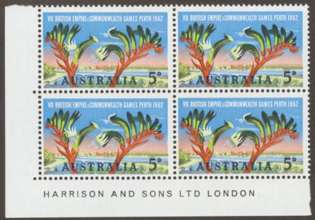 | 5d Perth Empire Games, Harrison Imprint block of 4, BW 390z, no perfs in lower margin |