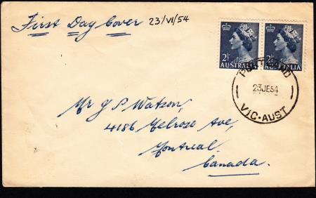 | 23 Jun 1954 FDC New QEII Stamp SG261a 2½d Blue Pair on private cover postmarked Portland Vic and addressed to Montreal Canada